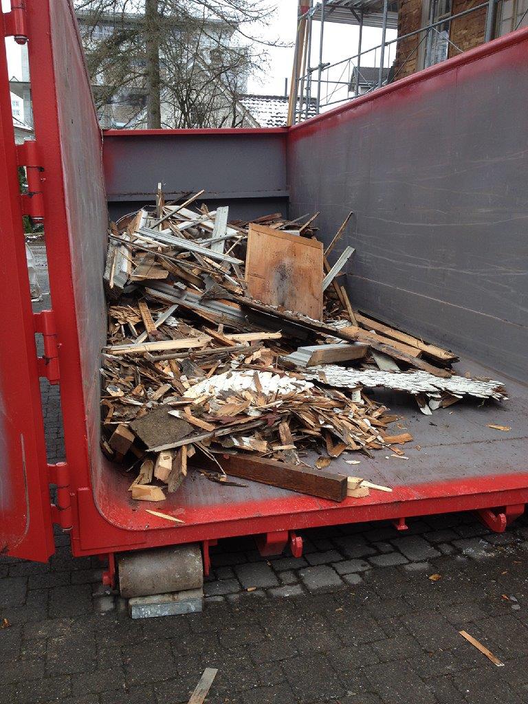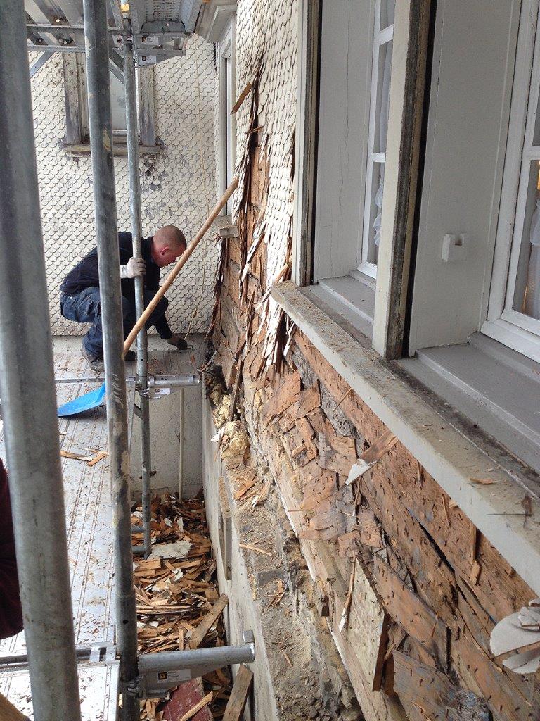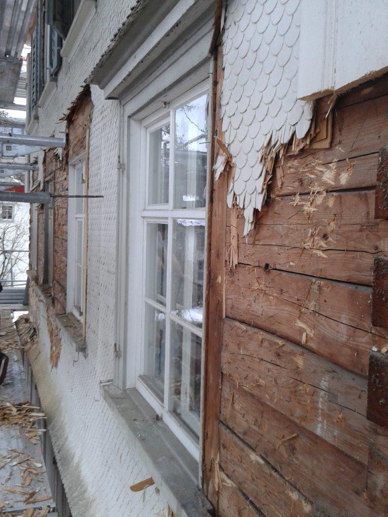 Zu Beginn einer Sanierung oder einer Reparatur werden alle morschen, faulen oder defekten Teile abgebrochen. Je nach Umfang der Sanierungsarbeiten wird nur eine Schicht, zum Beispiel die Schindeln, abgebrochen oder eben der ganze Fassadenaufbau bis auf das tragende Gerippe. Bei den Abbrucharbeiten wird darauf geachtet, dass angrenzende Bauteile wie Fenster nicht beschädigt werden. Der Schutt wird direkt abgeführt und fachgerecht entsorgt.